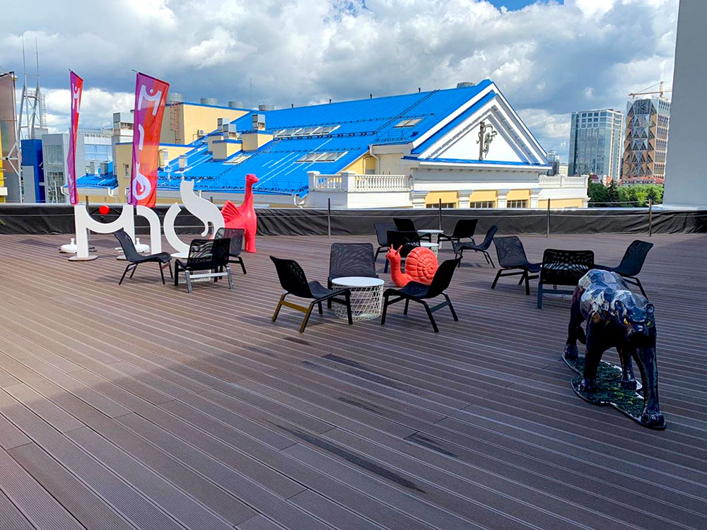 И как вариант напольного покрытия для террасы, обратите внимание на доску из ДПК DECKRON, Доска с семью ребрами жесткости и с зауженными швами, что не дает проваливаться каблукам и шпилькам ваших прекрасных посетительниц.