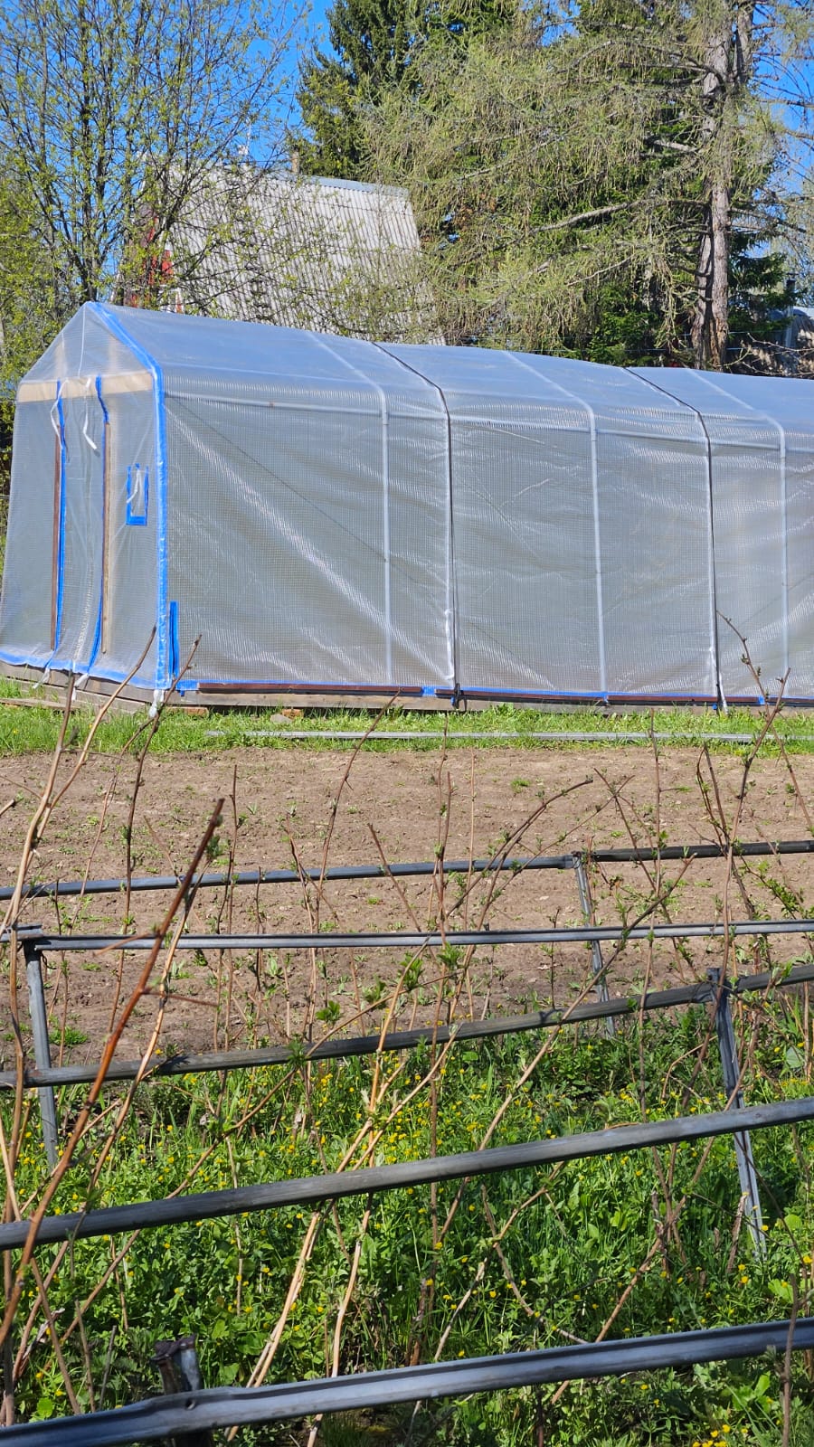 По низу добавлен материал пленки, чтобы чехол доставал до земли. Но все равно мы рекомендуем обустроить низ теплицы фундаментом из бруса или толстой доски, чтобы было к чему крепить и прижимать чехол.